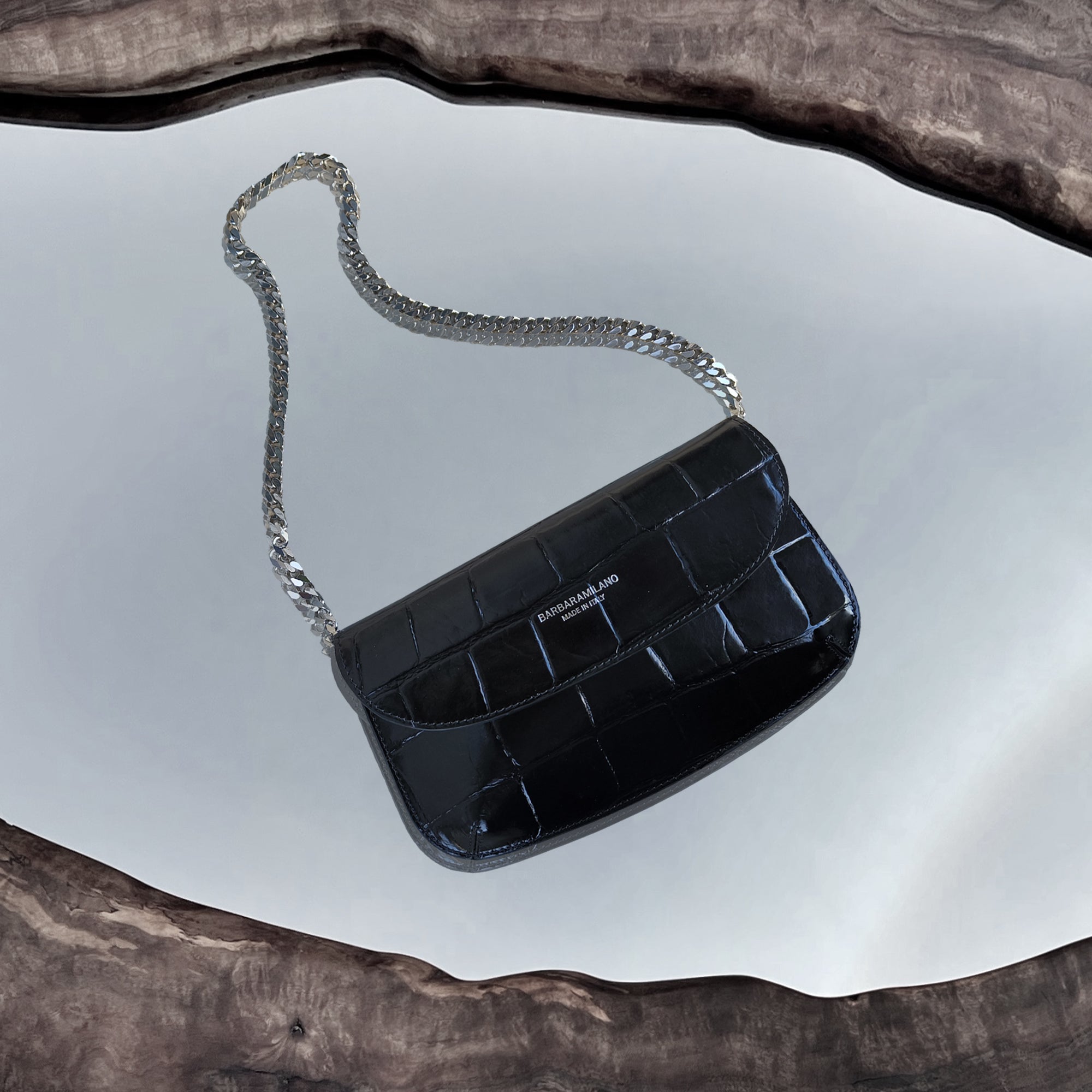 "B'Kiss" is a whisper of elegance, where leather meets chain in a graceful embrace, evoking a sense of timeless allure. Compact yet commanding in presence, B'Kiss holds your essentials with poise, offering a delicate balance of function and beauty. In its form, we find a modern romance, a perfect companion for the urban adventurer who values both style and substance.